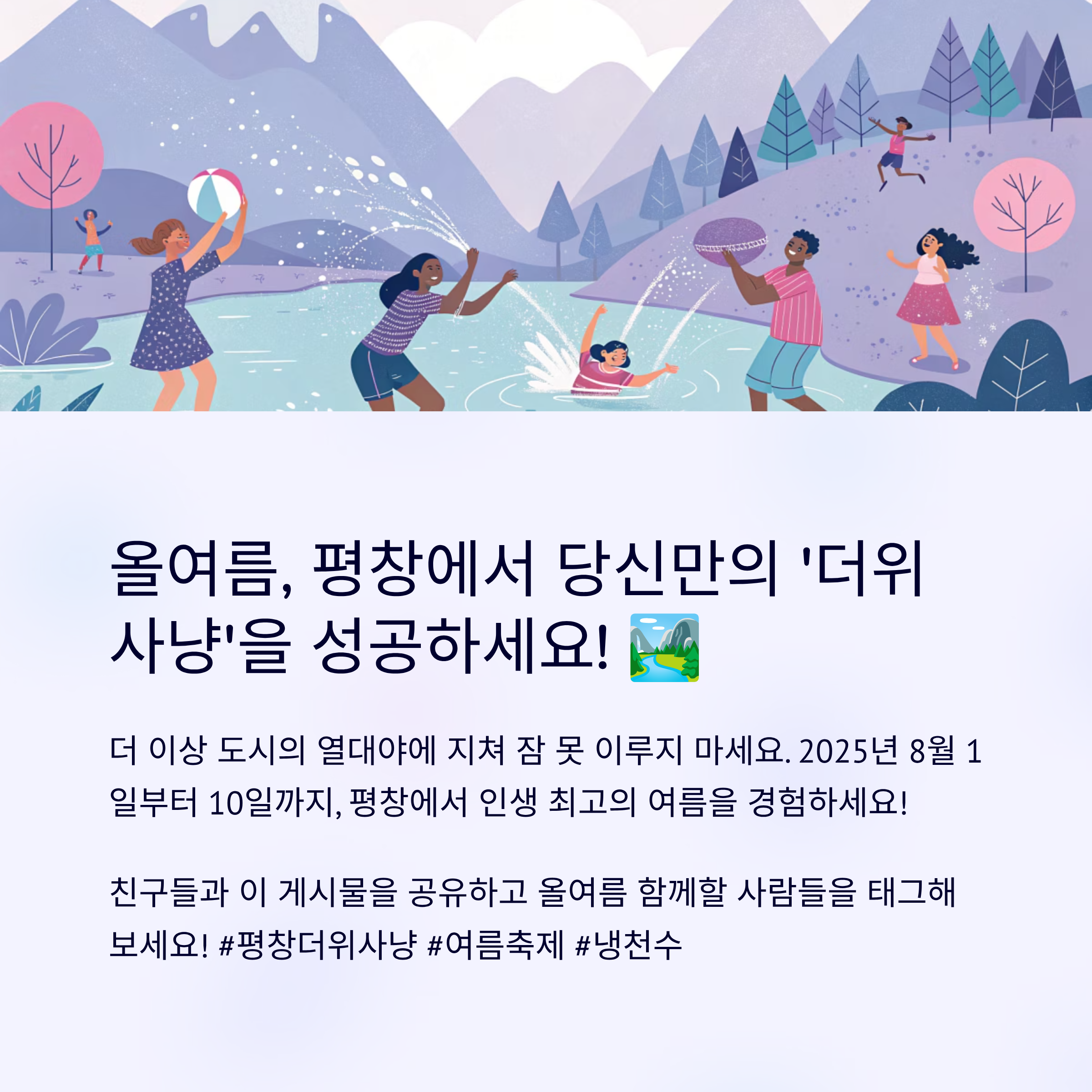 더 이상 도시의 열대야에 지쳐 잠 못 이루지 마세요. 올여름, 주저 말고 강원도 평창으로 떠나세요. 그곳에서 당신만의 **'더위 사냥'**을 성공하고, 평창이 선사하는 마법 같은 순간들을 만끽하며 인생 최고의 여름을 만들어 보세요. 저 또한 그곳에서 여러분을 기다리고 있겠습니다! 여러분의 2025년 여름, 평창에서 특별한 추억을 만들어 보는 건 어떠세요?