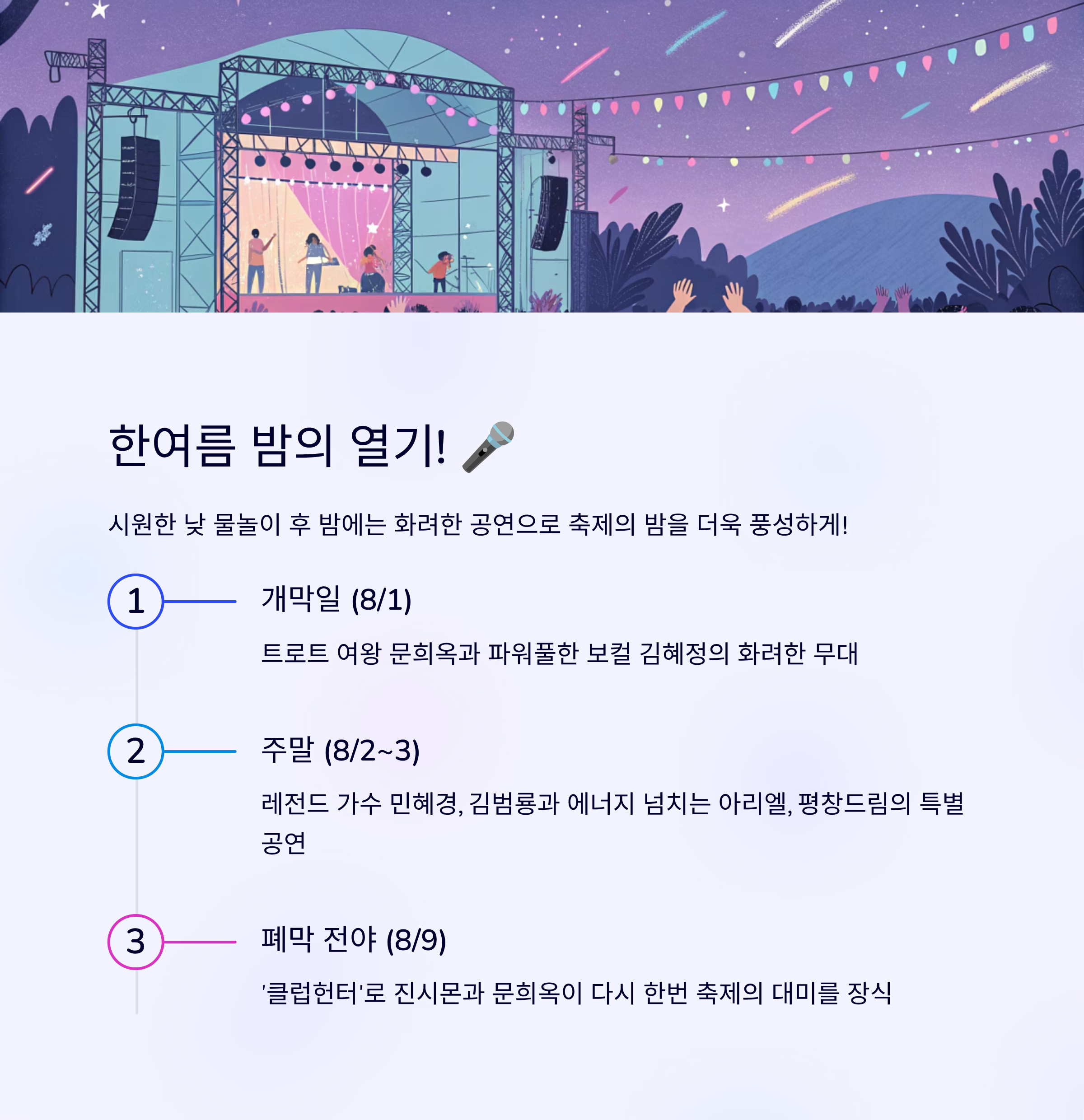 - 주말 (8월 3일 일): 에너지 넘치는 **아리엘**과 지역의 자랑 **평창드림**의 특별한 무대.